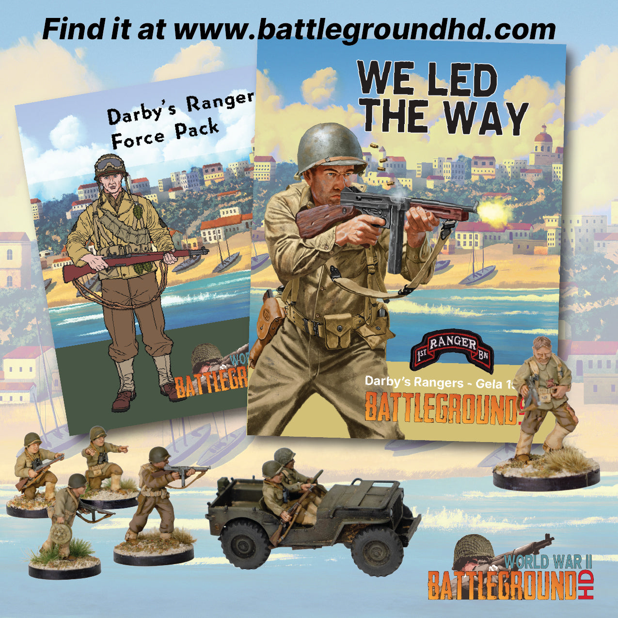 We Led the Way is a narrative-driven scenario book for BattlegroundHD, focusing on the hard-fought opening actions of Operation Husky and the U.S. Army Rangers’ landings at Gela, Sicily in July 1943.